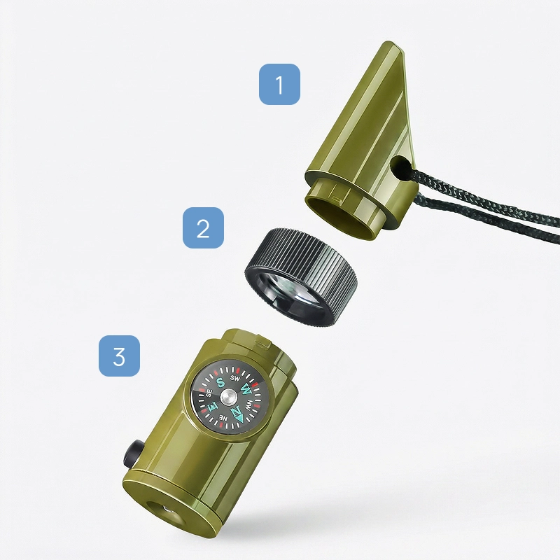 Sou nova em acampamentos e este apito me faz sentir preparada. Bússola, espelho e luz cobrem a maioria das preocupações sem encher os bolsos de equipamentos.