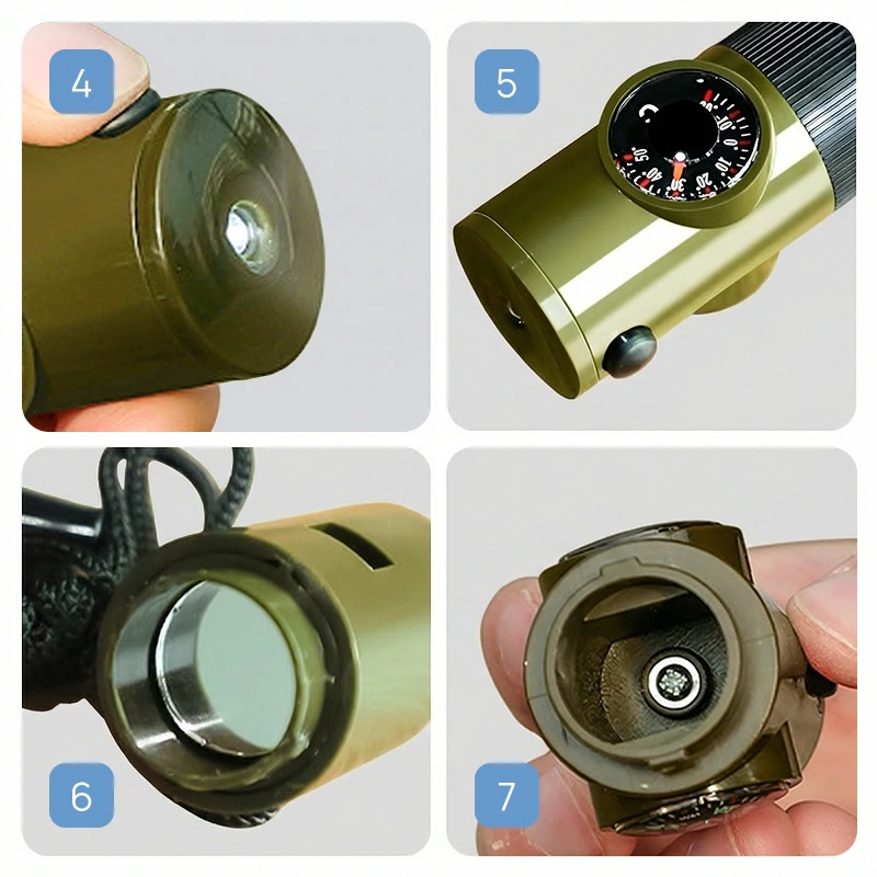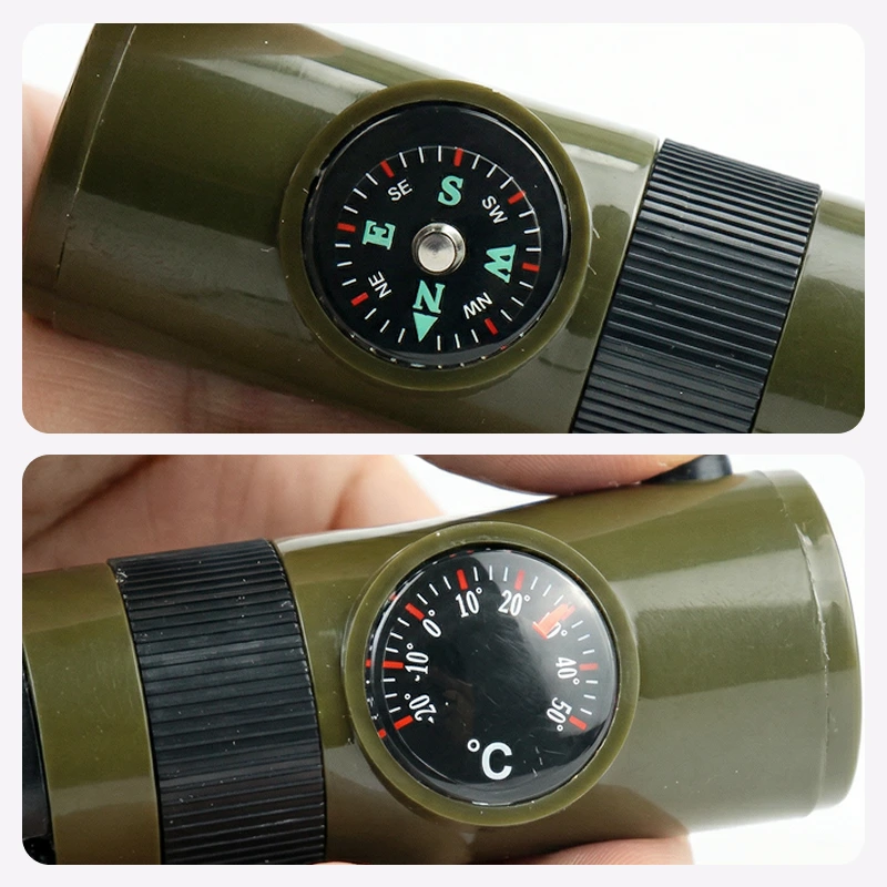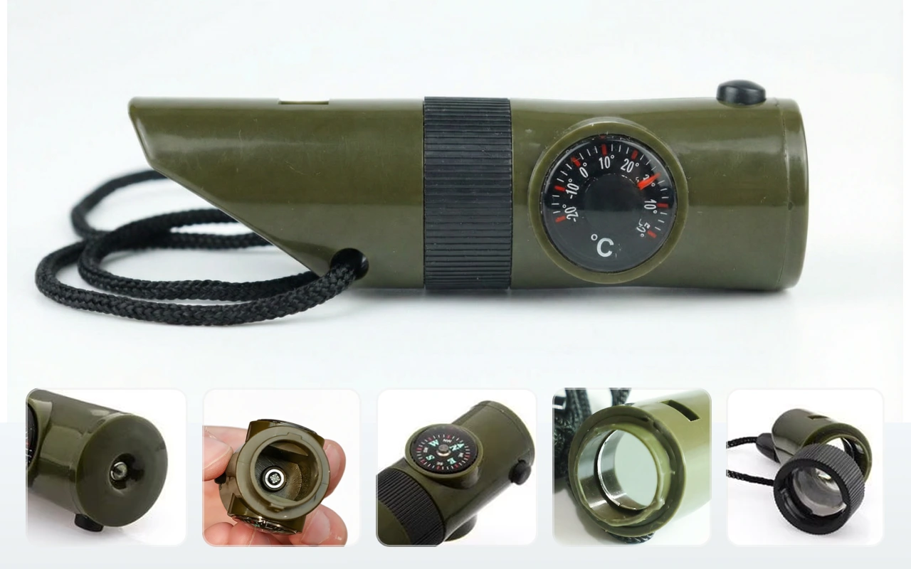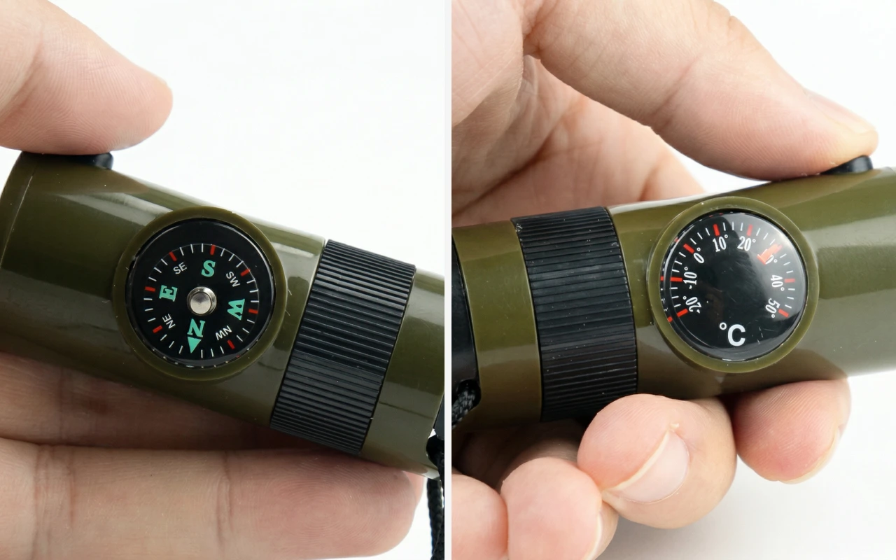 Comprei o apito de sobrevivência para acampamentos solo. Adoro ter o termômetro, o pequeno compartimento de armazenamento e a lanterna juntos, assim não preciso ficar revirando a mochila.