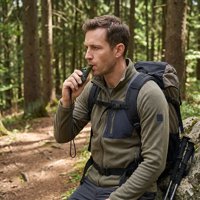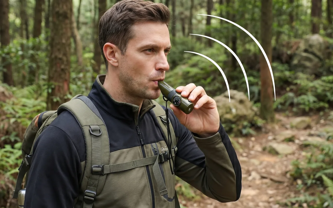 Prendo o apito na minha mochila quando caminho nas montanhas. É leve, prático e a luz de emergência me acalma quando a neblina aparece de repente.