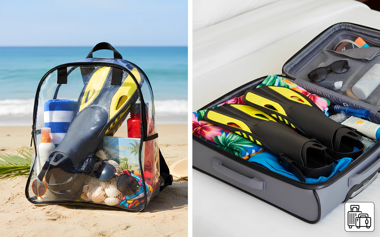 Nadadeiras leves cabem facilmente em qualquer mala ou bolsa. Perfeitas para férias, aulas ou viagens rápidas para a piscina.