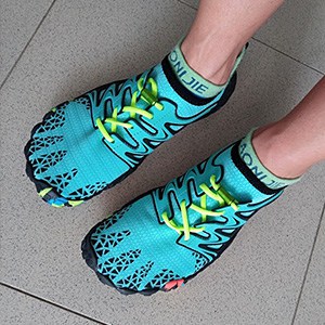 Os nossos ténis aquáticos permitem que os seus pés flexionem e dobrem como fariam na água, sem apertar os dedos ou arcos.