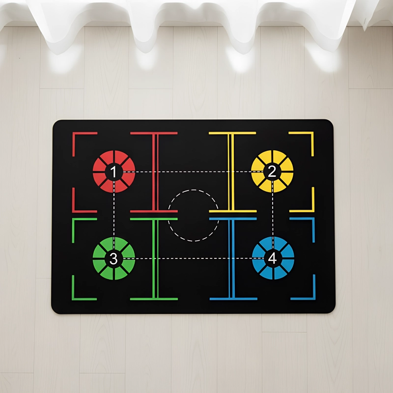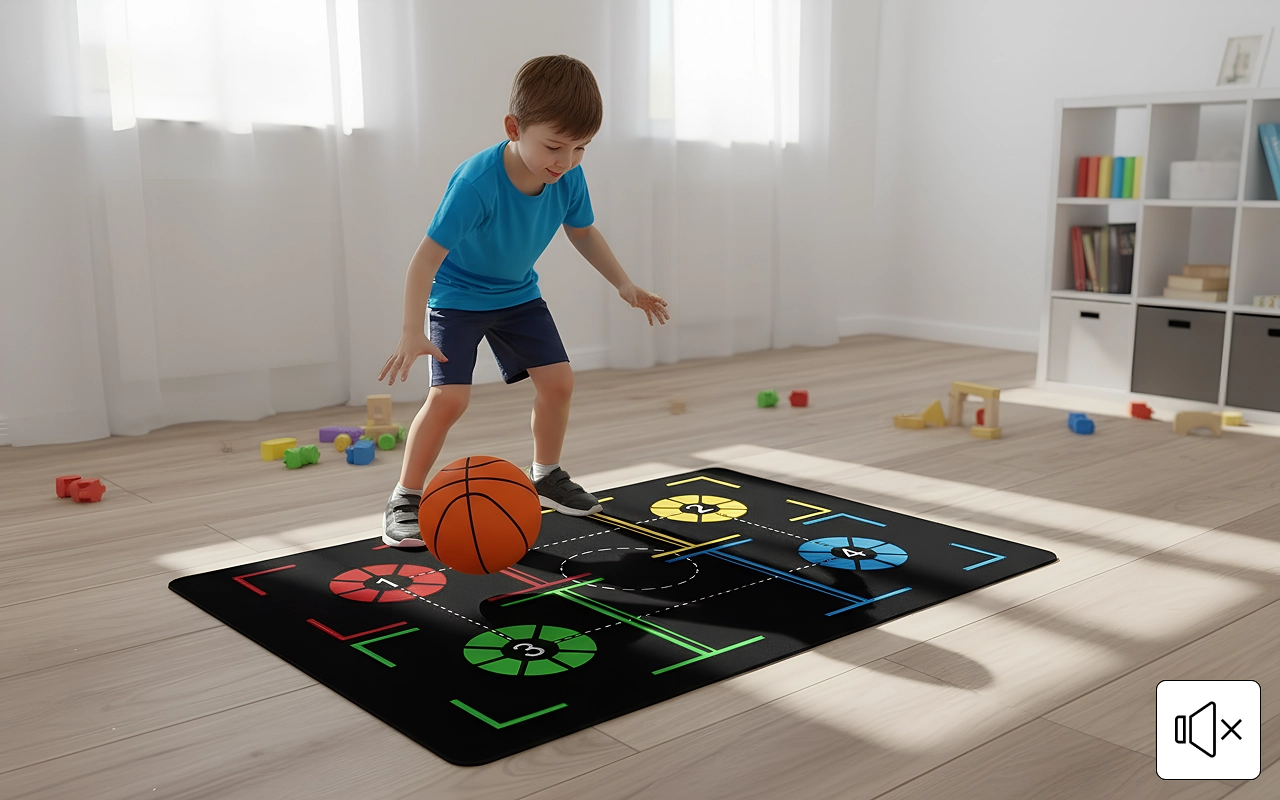 As zonas do tapete me ajudam a aprender onde colocar os pés. Posso praticar dribles silenciosamente à noite sem acordar meu irmãozinho.