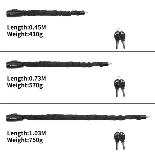 O cabo reforçado e alongado com aço de liga de alta resistência é mais longo e prático. Está disponível em diferentes comprimentos: 0,45m – 1,45m. Uma chave tipo crescente reduz efetivamente a taxa de abertura mútua e resiste aos métodos dos ladrões. Este cadeado pode travar várias bicicletas ou motociclos ao mesmo tempo. Também pode ser usado para escadas, portões, cercas, caixas de ferramentas, equipamentos desportivos e outros objetos importantes. Perfeito para prender a sua bicicleta numa árvore ou grade.