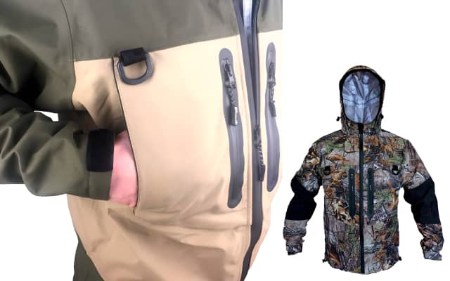 Bolsos especiais no peito facilitam esconder as mãos, mantendo-o aquecido em pescarias frias.
