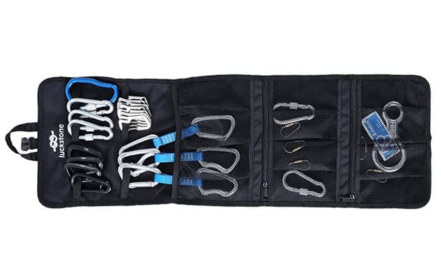 Armazenamento espaçoso e bem organizado para equipamentos de escalada.