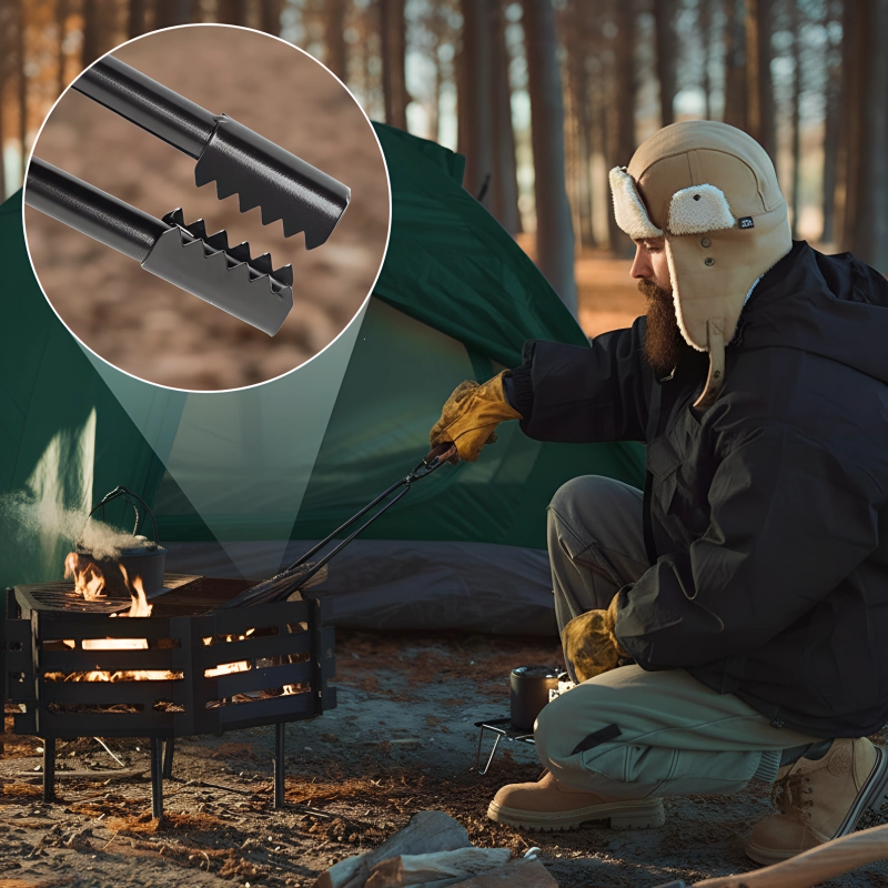 Construção em aço carbono resiste ao uso intenso ao ar livre. Mandíbulas robustas seguram toras ou brasas quentes com firmeza, sem entortar.