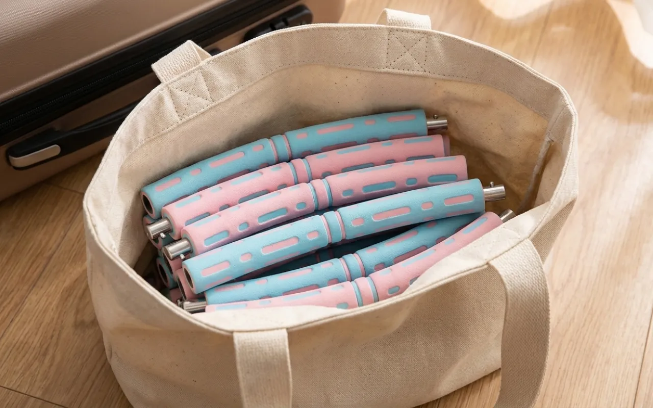 Viajo a trabalho e coloco as peças do aro na minha mala. Os quartos de hotel tornam-se o meu pequeno ginásio e mantenho a cintura em forma na estrada.