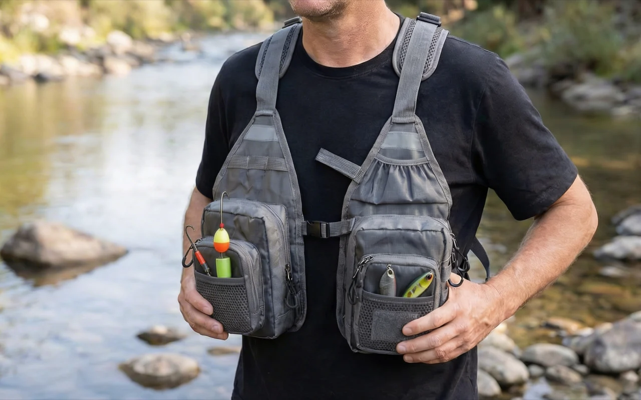 Pesco de caiaque e precisava de algo compacto. Este colete mantém minhas ferramentas altas e secas, com o puçá e o alicate exatamente onde minhas mãos esperam encontrá‑los.