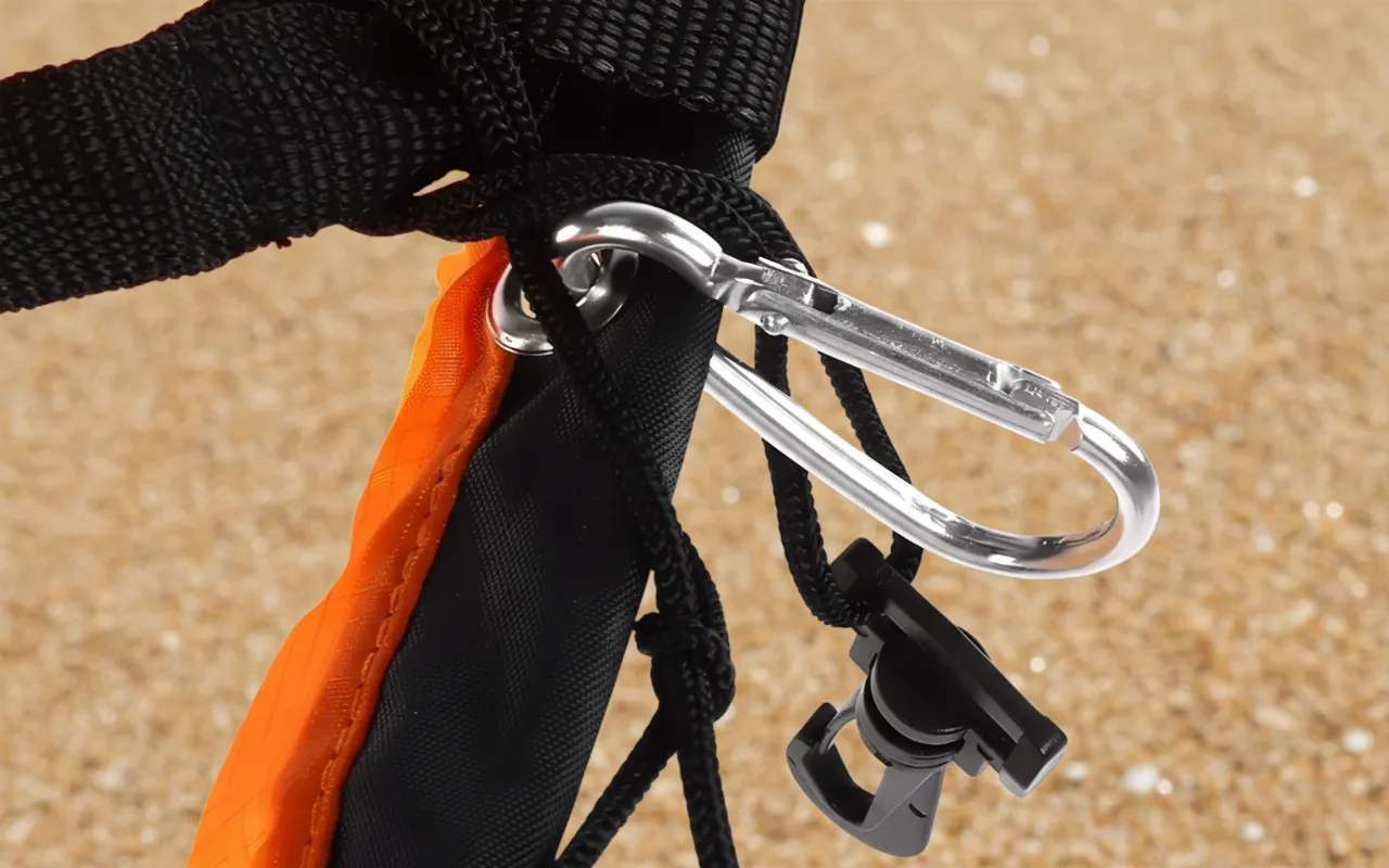 Abra e prenda a vela para caiaque Threo em segundos, usando mosquetões resistentes. Nenhuma ferramenta ou instrução complicada atrasa você na margem.