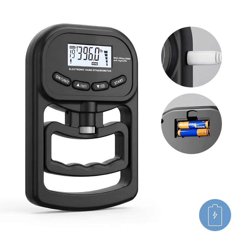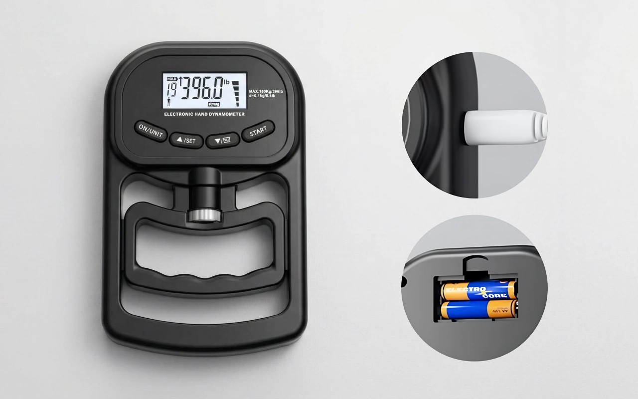 Escolha entre carregamento por USB ou pilhas tradicionais conforme necessário. Continue a usar o dinamómetro de preensão Threo sem se preocupar em ficar sem energia.