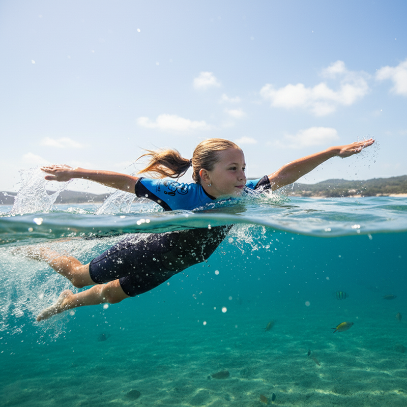 Mangas curtas e material elástico possibilitam movimentos livres e suaves a todo momento. As crianças podem mergulhar, nadar ou brincar sem sentir restrição ou aperto.