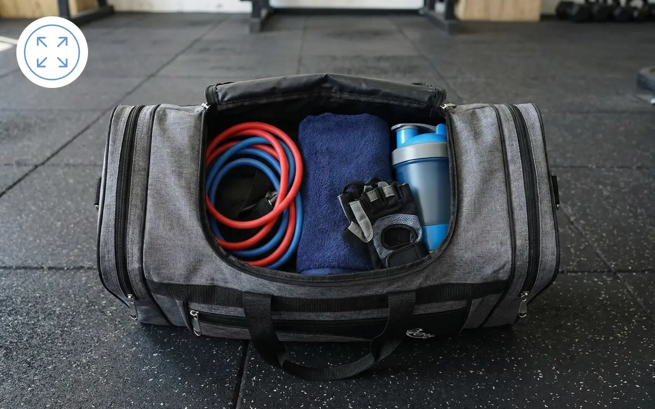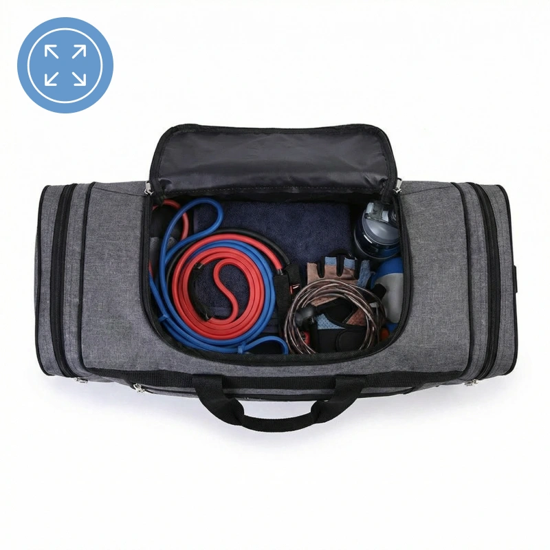 Guarde todo o equipamento de treino, incluindo toalhas, em uma bolsa espaçosa. Nunca mais se preocupe com falta de espaço.
