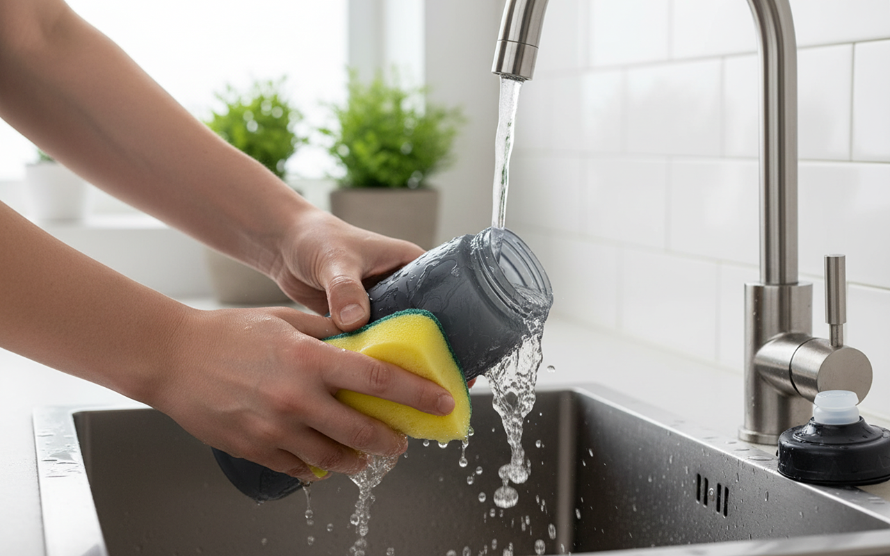 A boca larga permite alcançar todos os cantos facilmente. Tenha sempre uma garrafa limpa e fresca.
