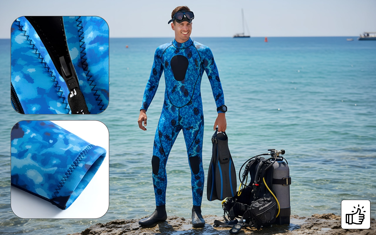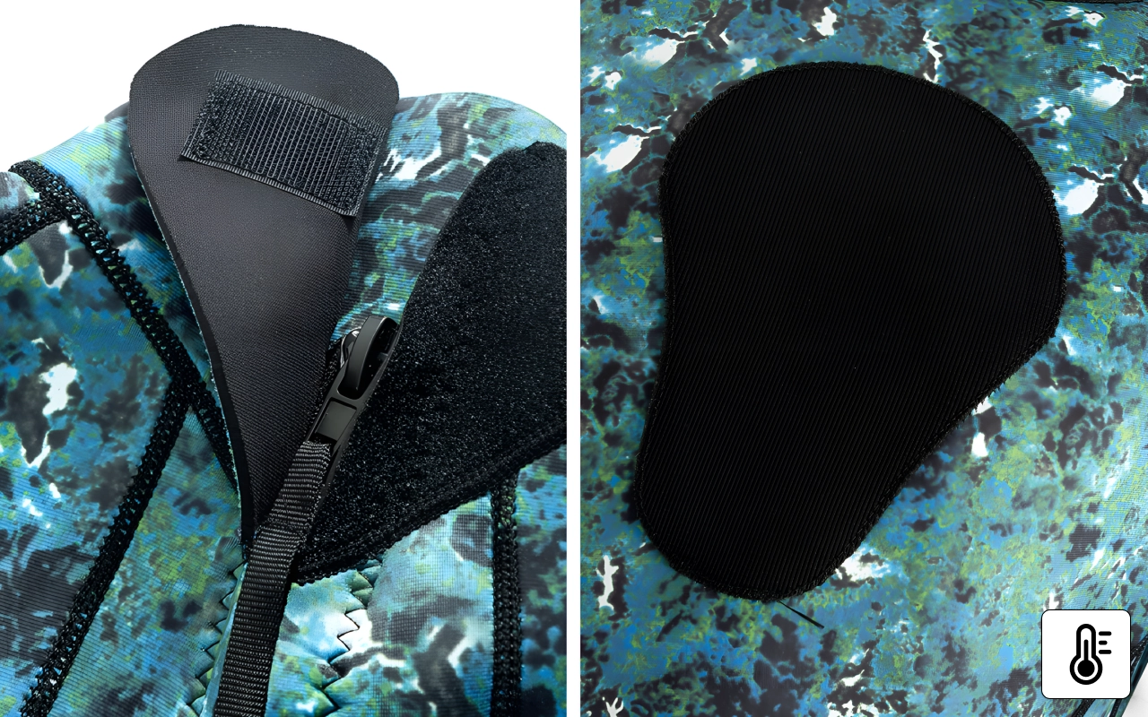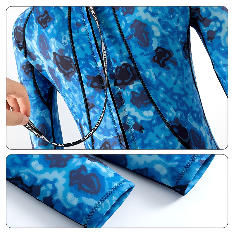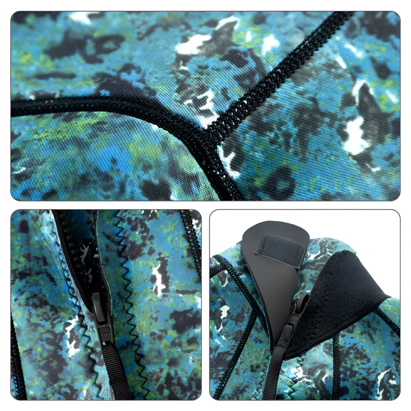 O design camuflado esconde você de criaturas do mar e perigos. Construção durável protege a pele contra picadas, arranhões e objetos pontiagudos.