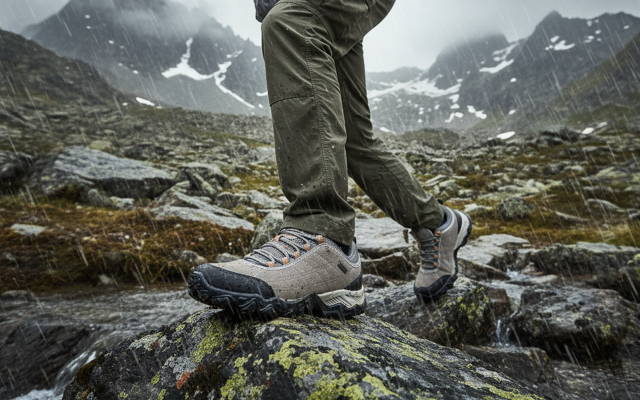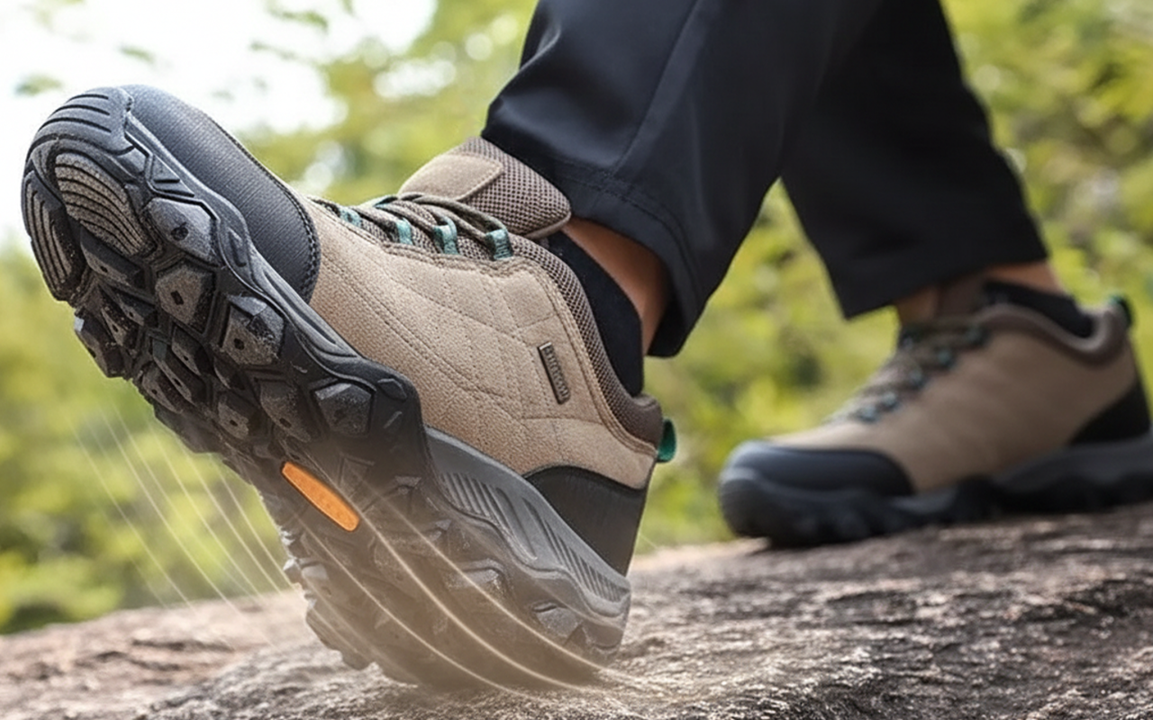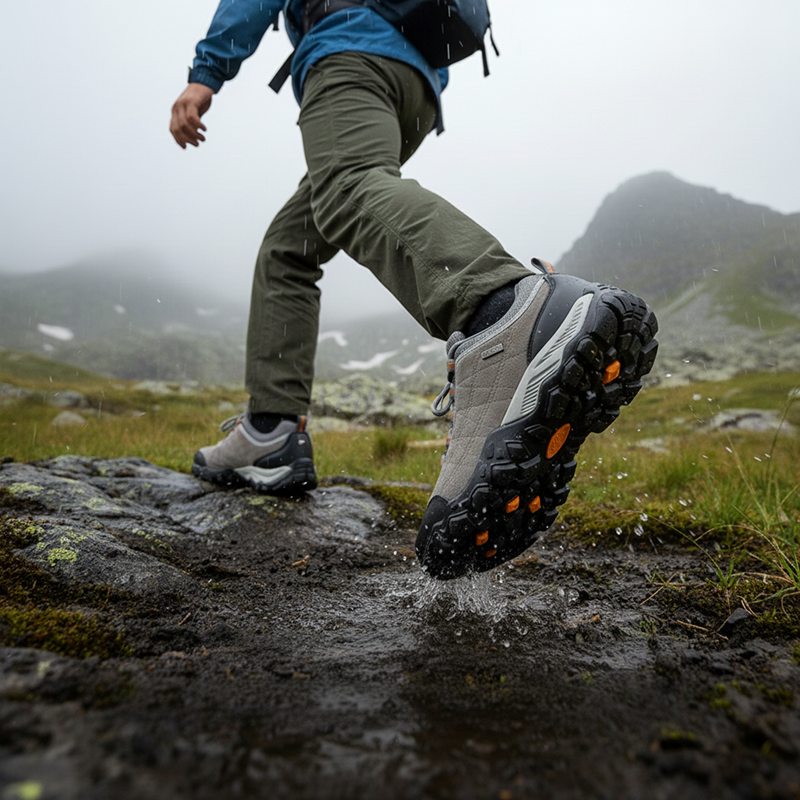 Solas de borracha aderem firmemente em superfícies molhadas ou soltas. Caminhe com confiança sobre pedras, lama ou grama em qualquer clima.