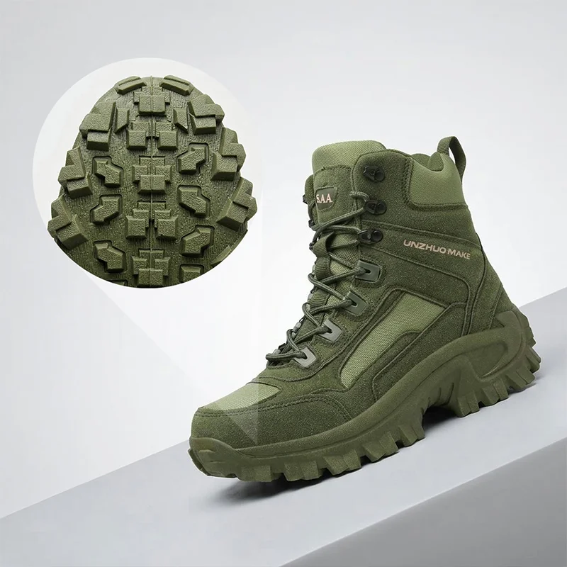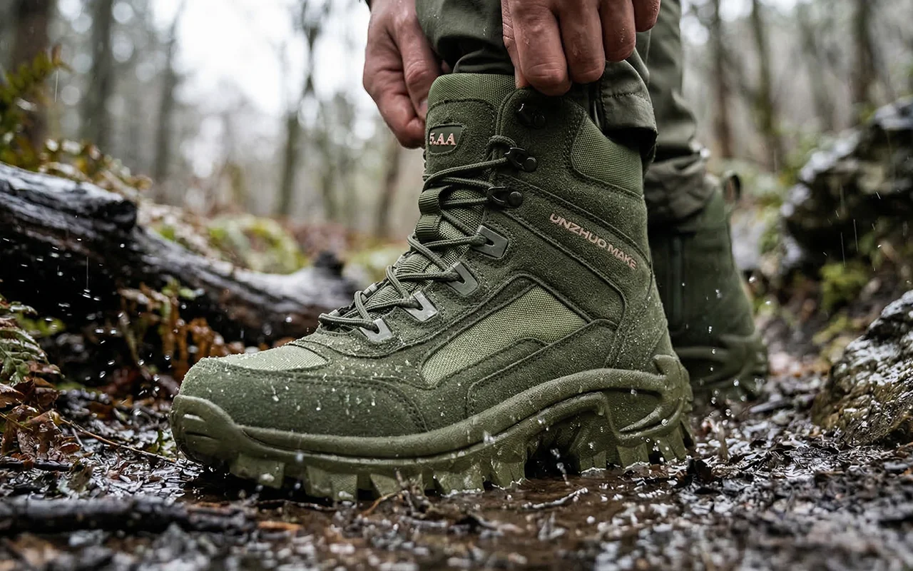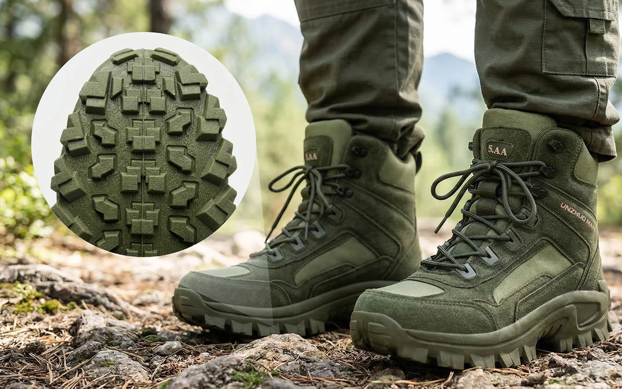 Solas antiderrapantes oferecem estabilidade em lama, cascalho ou pedra. Cada passo é firme graças aos sulcos profundos e à aderência robusta.