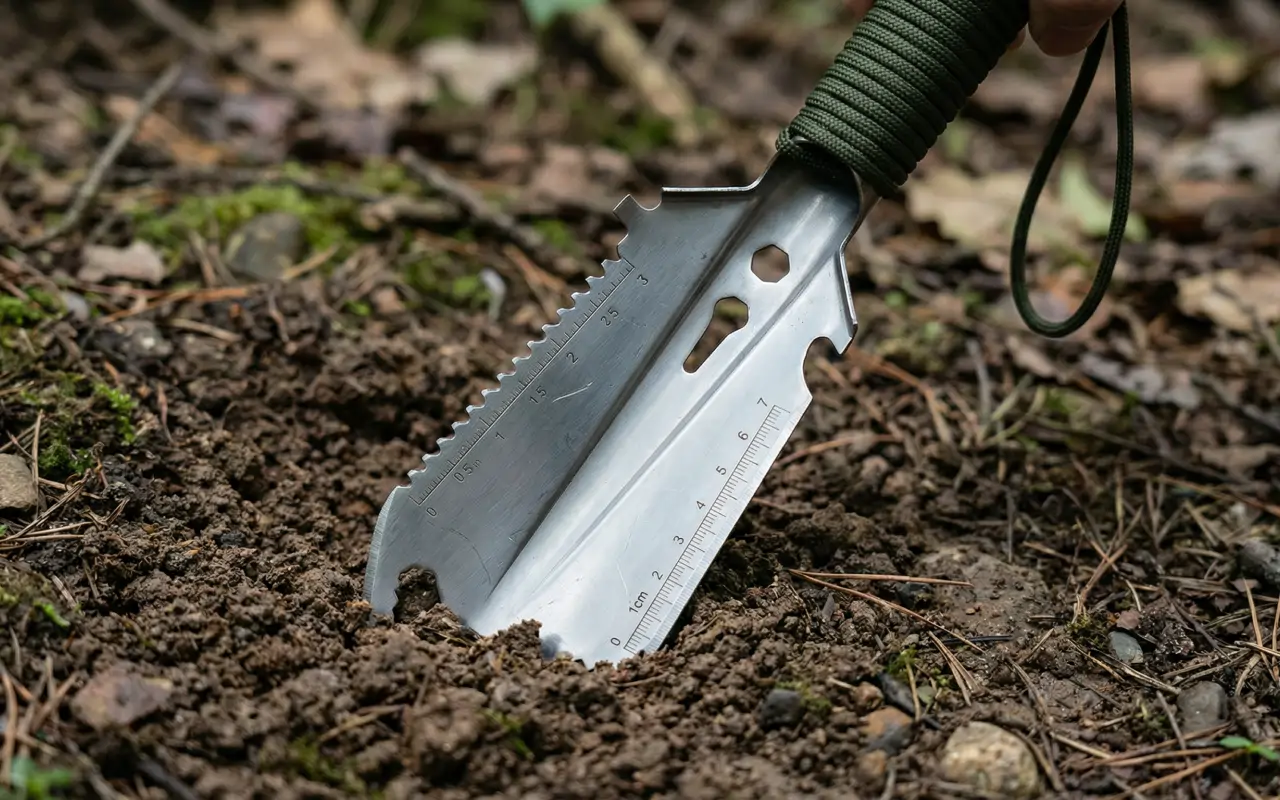 Usei a pá de camping durante uma trilha nas montanhas; ela ajudou a limpar raízes da trilha, cavar um pequeno local de abrigo e cortar gravetos para assar.