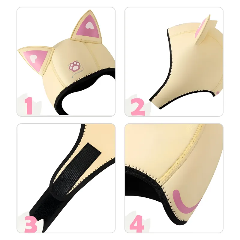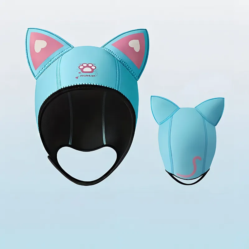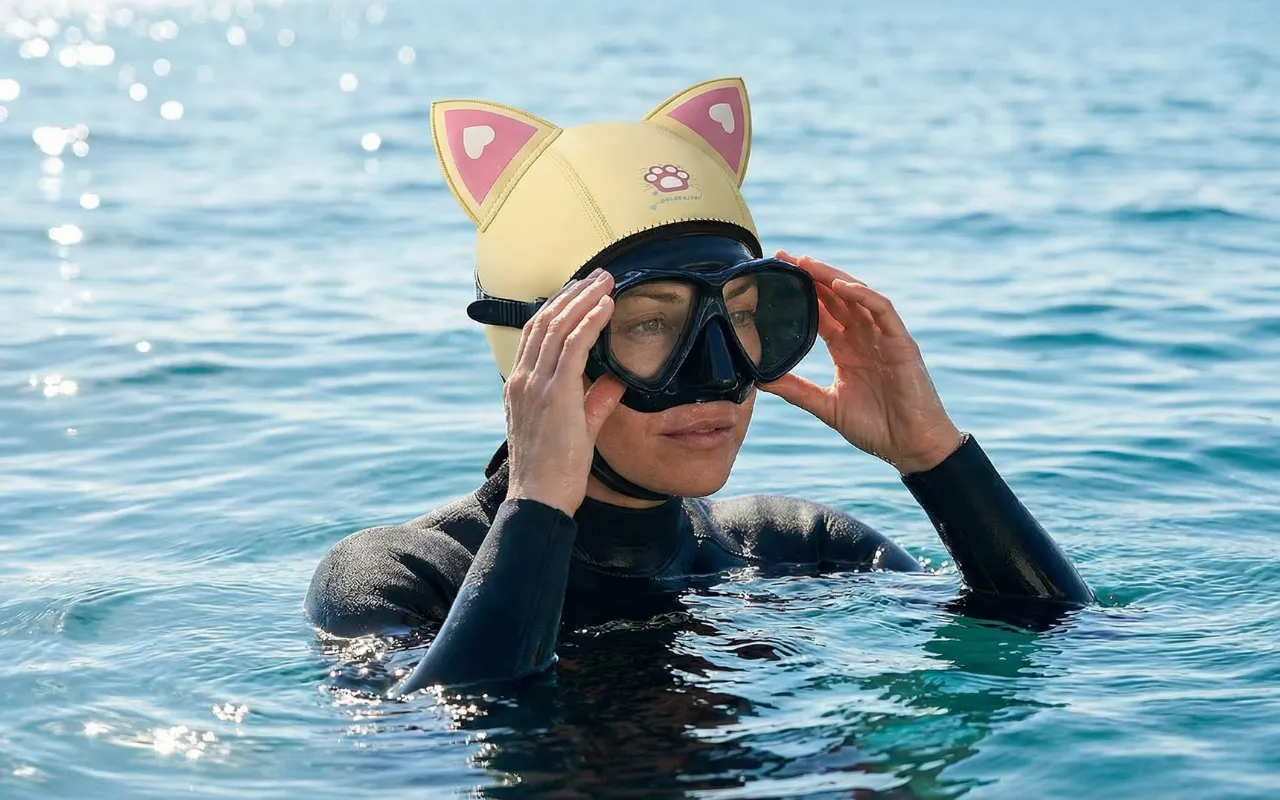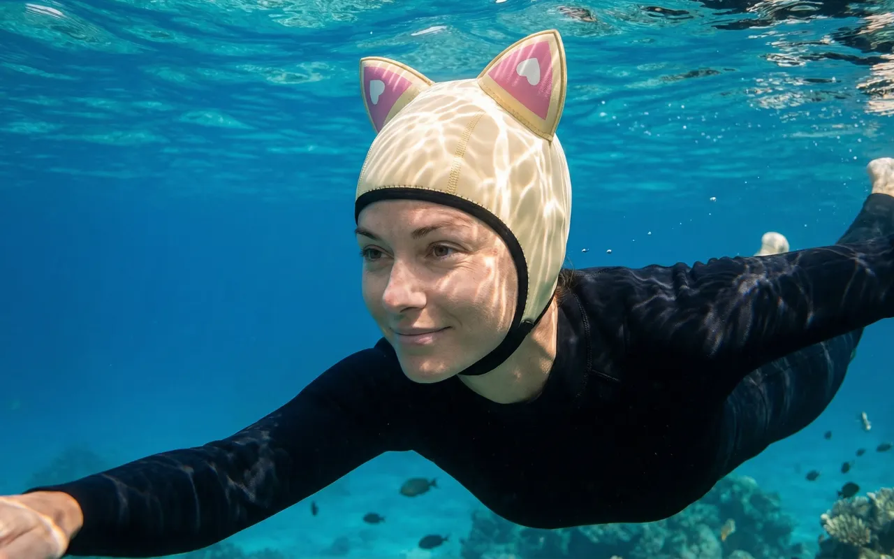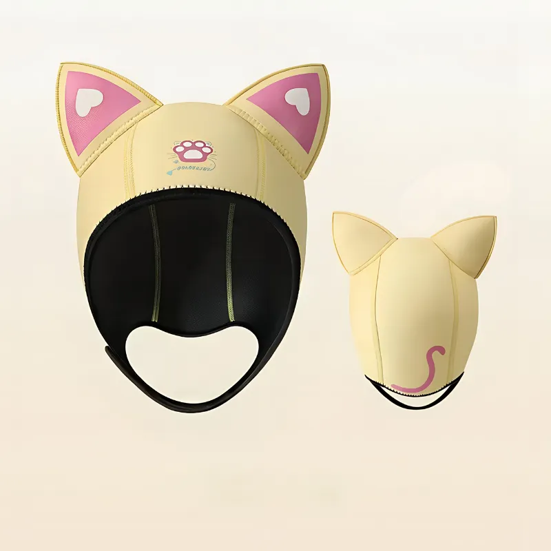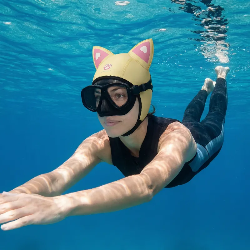 Nunca mais cabelo bagunçado ou cabeça gelada depois das aulas de mergulho. Minha irmã também quer uma porque as orelhas de gato deixam muito legal!