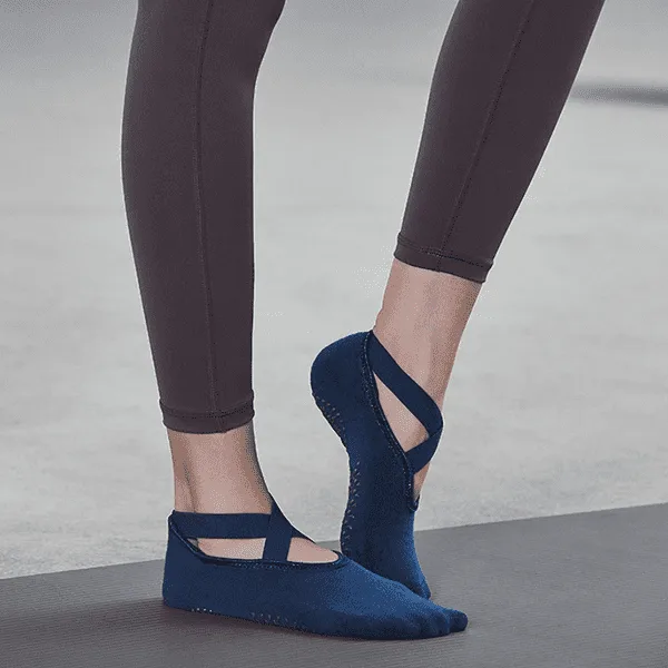 As Meias Threo para Yoga são meias de treino concebidas para mulheres que praticam yoga, pilates, barre, balé e dança. Alças e grips antiderrapantes aumentam a estabilidade durante o exercício, e o tamanho único serve para todas as entusiastas do fitness. Desfrute de higiene, conforto, suporte e tração mesmo descalça.