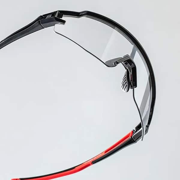 Com um design especial de revestimento, a lente é antiembaçante, hidrofóbica, resistente à sujidade e repelente de óleo. A lente dos óculos é feita de PC (policarbonato). Este material bloqueia 100% dos raios UVA, UVB e UVC, assim como a luz azul nociva até 400 nm. As almofadas de silicone macias para o nariz ajustam-se perfeitamente a qualquer formato de nariz, garantindo o máximo conforto ao usar. Além disso, a construção sem armação não bloqueia a visão e proporciona uma visão periférica mais clara.