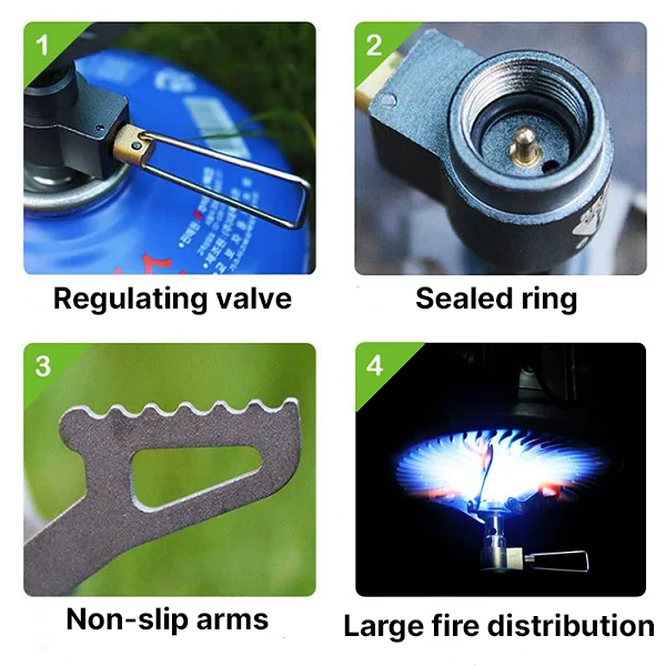 O nosso dispositivo é bastante compacto e leve. O seu design dobrável e peso de 25 gramas tornam-no fácil de transportar e levar consigo durante a caminhada sem adicionar peso à sua mochila. O nosso fogareiro a gás possui também válvula de controlo ajustável para realizar controlo da chama. Pode ser facilmente regulado de fogo brando a fervura total, rodando a válvula de combustível no sentido horário ou anti-horário. Além disso, o Fogareiro THREO é seguro para usar. Adopta um anel vedado para prevenir fugas de gás e braços serrilhados para evitar que a panela escorregue.