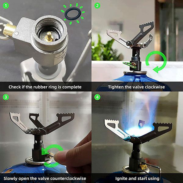 A instalação do nosso fogareiro mini é super fácil, não requer ferramentas especiais e levará apenas 10 segundos. Por favor, observe todas as precauções e não permita que crianças utilizem o produto. Certifique-se de que a válvula de controlo esteja completamente fechada antes de rosquear o fogareiro. Primeiro, aperte a válvula do fogareiro mini no botijão de combustível no sentido horário usando as mãos. Depois, desdobre os 3 suportes de panela superiores. Finalmente, abra a válvula no sentido anti-horário e comece a usar o fogareiro mini.