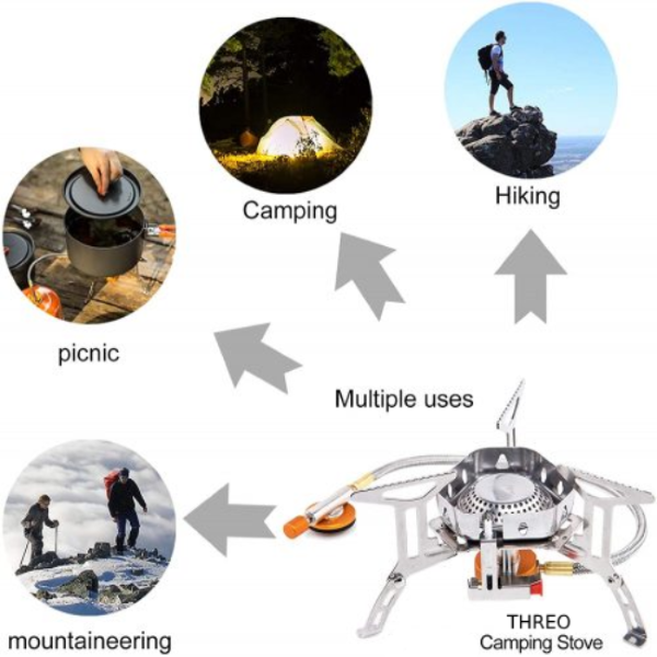 O filtro de suporte à combustão torna a chama mais intensa. Com 3000W de potência forte, ferve 1L de água em cerca de 3 minutos. O design em malha de favo de mel com defletor de vento e combustão concentrada da chama economiza 30% de gás. Além disso, os suportes serrilhados aumentam o atrito entre o fogão e a panela, proporcionando maior aderência. Este fogão portátil é perfeito para campismo, caminhadas, mochilismo, montanhismo, pesca e para quem prefere viajar leve.