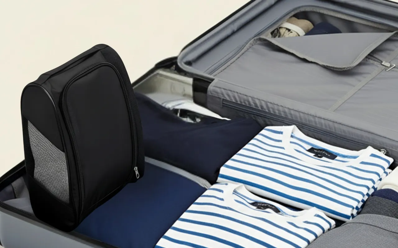 Super leve e cabe meus dois sapatos. É fácil de carregar e quando abro o zíper, minhas roupas na mala nunca mais ficam com cheiro de chulé!
