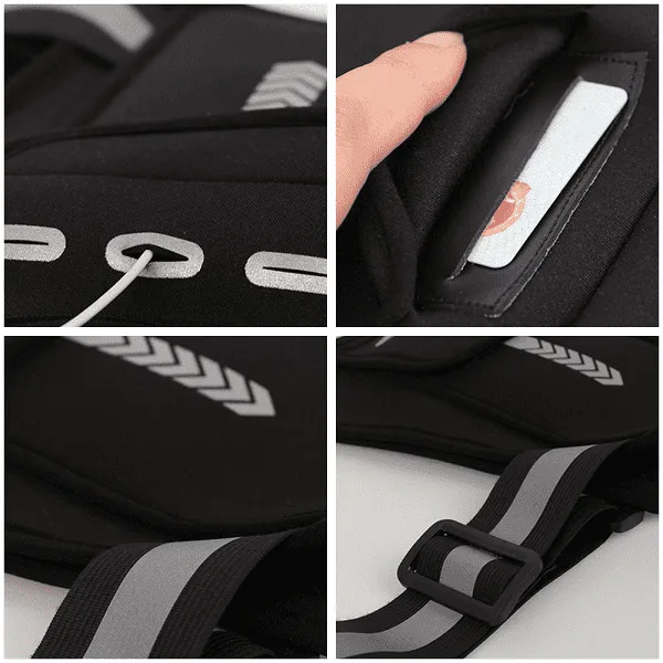 As faixas refletoras na nossa bolsa peitoral permitem que permaneça visível em condições de pouca luz, possibilitando correr com segurança no início da manhã ou no final da noite.