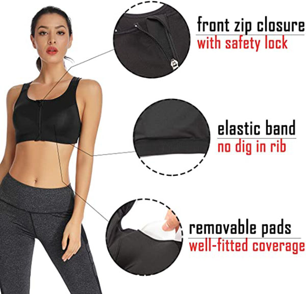 A alça traseira em formato I protege efetivamente contra impactos e evita que o sutiã se desloque ou escorregue. O sutiã possui um zíper anti-deslizamento e ganchos que impedem que ele escorregue durante o exercício. A faixa de suporte ajustável nas costas, semelhante a um sutiã comum com 3 níveis de fechos, permite ajustar o tamanho da copa.