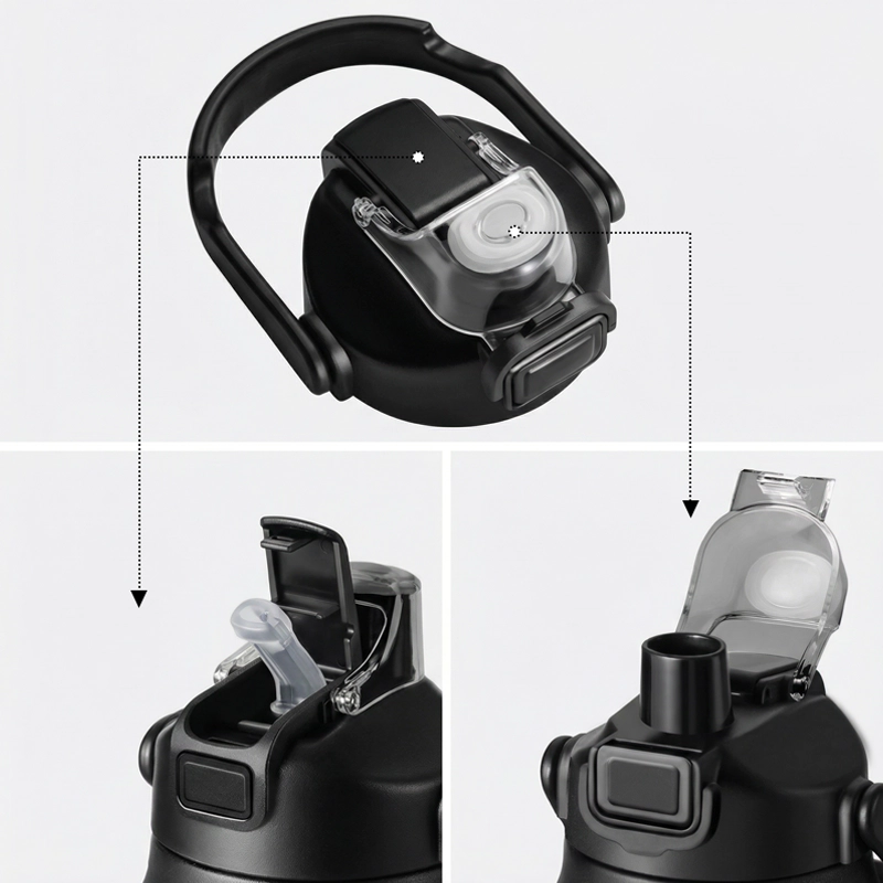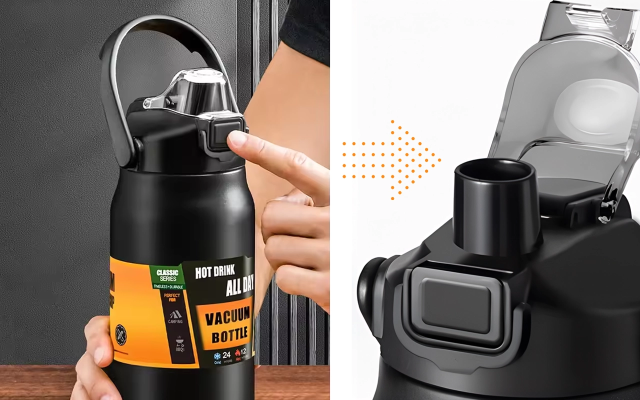 Um toque abre a tampa para beber facilmente a qualquer momento. Tampa à prova de vazamentos e trava de segurança evitam derramamentos na bolsa.