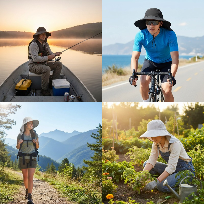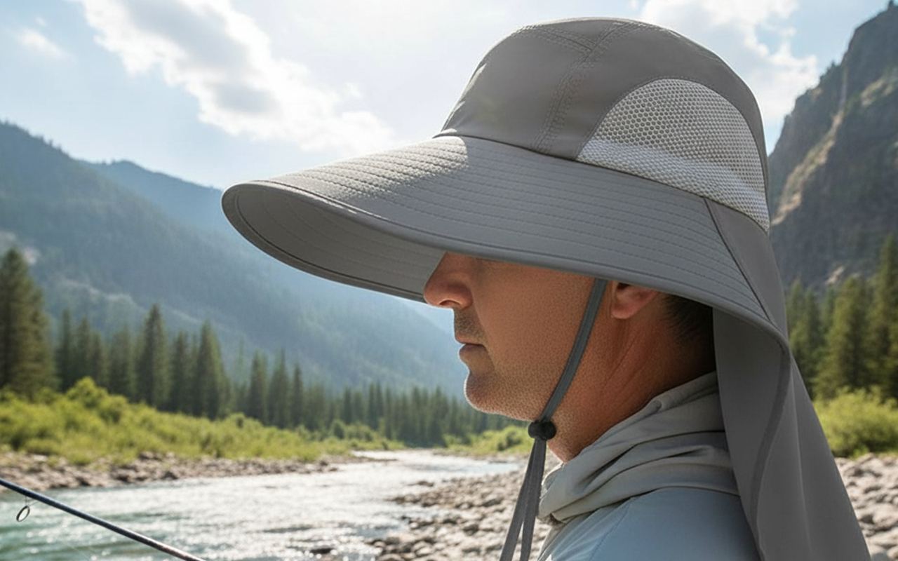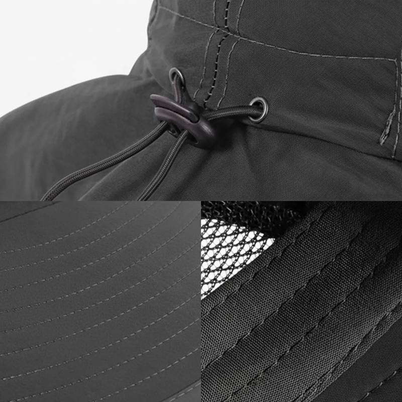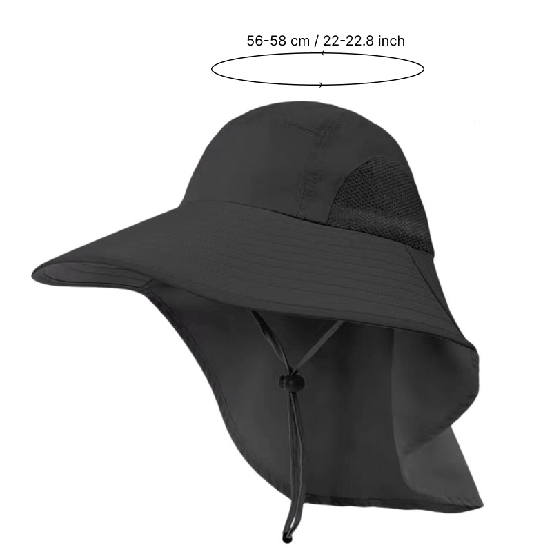 O tecido de aba larga ajuda a bloquear os raios fortes e evitar queimaduras. A aba estendida oferece cobertura extra para o pescoço e as orelhas.