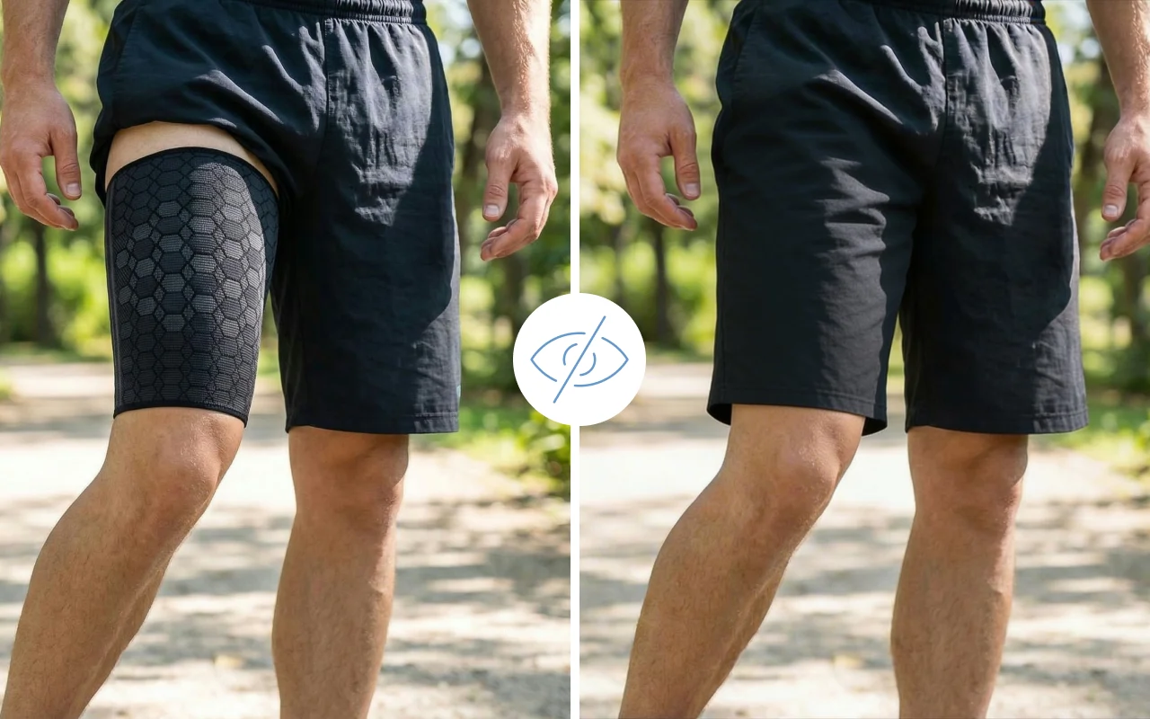 Eu uso essa manga durante longos turnos no armazém e minha coxa não lateja mais no fim do dia. Fica escondida sob minhas calças largas.