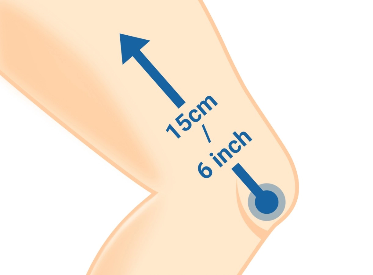 - 2. Envolva a fita métrica ao redor da parte mais larga da sua coxa, cerca de 15 cm/6" acima do meio da rótula.