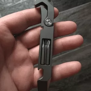 O dispositivo Threo reúne abridor de latas e garrafas, régua, faca, pé de cabra e chave de fendas numa única ferramenta EDC robusta. Isto oferece versatilidade incomparável, deixando-o pronto para qualquer ocasião ao ar livre.