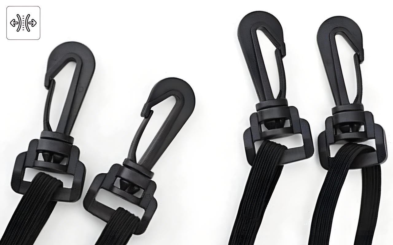 Este treinador estica bastante sem arrebentar, tornando-o seguro para rotinas de alta energia. Ele absorve impactos suavemente, prevenindo tensão nos braços e ombros.