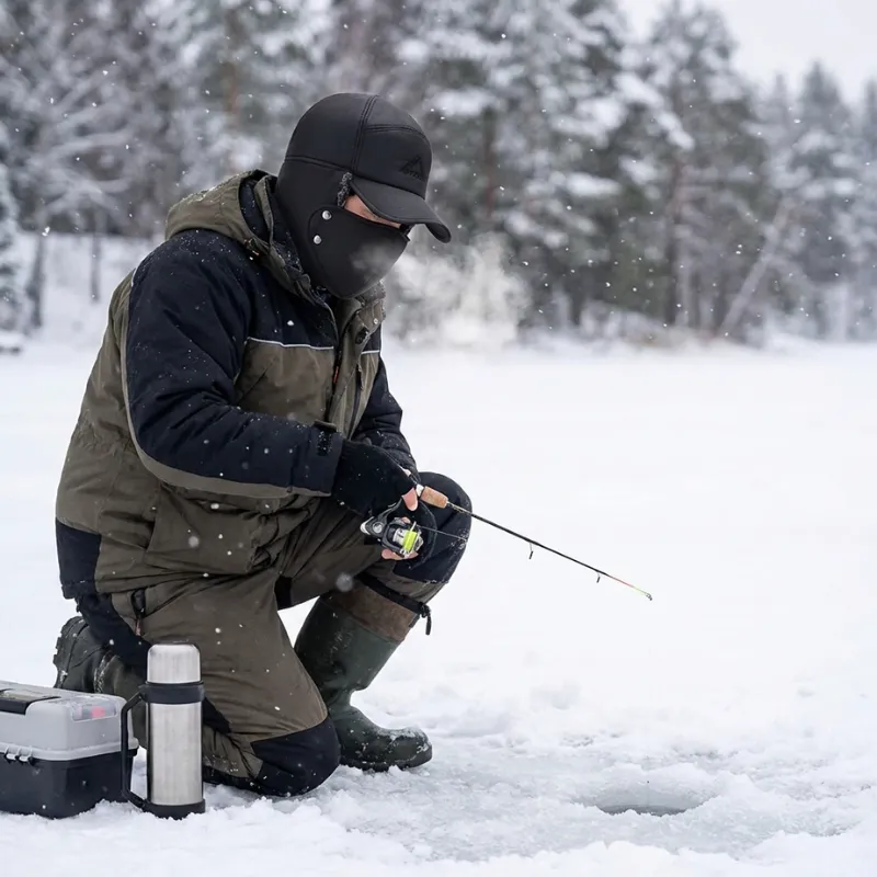Uso o gorro enquanto pesco no gelo. As abas felpudas bloqueiam a brisa do lago, e a máscara impede que meu rosto arda. Fica confortável por cima das minhas orelhas.