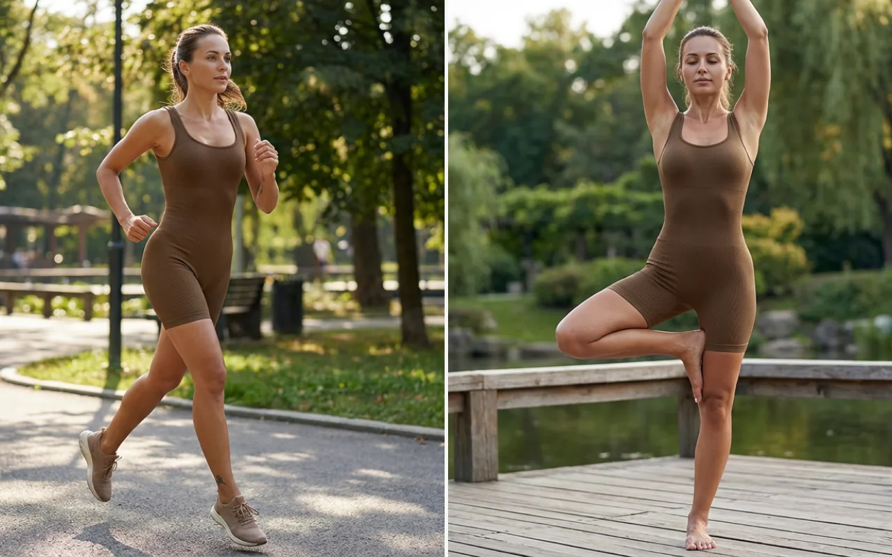 Tenho tamanho plus size e estava nervosa para tentar uma peça única. Este macacão me surpreendeu — super elástico, valoriza o corpo e continua confortável em agachamentos, avanços e alongamentos longos.